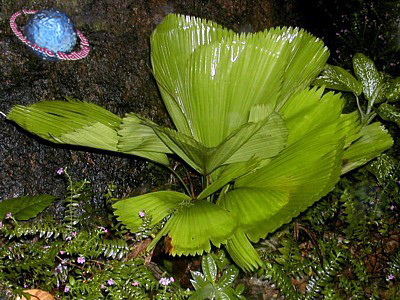 This species of fan palm is commonly known as ruffled fan palm and has the botanical designation Licuala grandis.