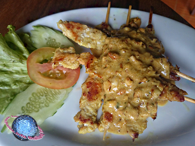 A dish of chicken satay with peanut sauce, sprinkled with some fried garlic, and served with salad and some slices of cucumber and tomato.