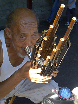 An elderly man playing the sheng, a traditional Chinese reed mouth organ.