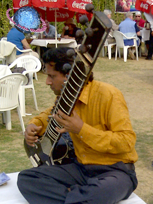 A man playing the sitar, i.e. an Indian long-necked bowl lute. It is similar to the veena, which in Hindu mythology is the preferred instrument of Sarasvati, the goddess of art and learning (fig.).