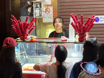 Tanghulu — a traditional Northern Chinese street candy of fruit skewered on a stick and coated in a glass-like sugar shell of hardened syrup — for sale in the lively streets of Bangkok's Chinatown (fig.).