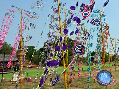 They are made by weaving dyed cotton threads around crossed bamboo slats, forming colorful geometric patterns.