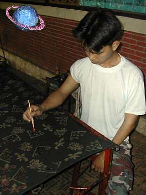 Painting batik patterns on textile covering the parts that need no colouring with wax.